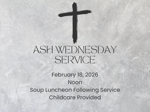 Ash Wednesday service is on February 18th at noon. Childcare will be provided during the service. Soup luncheon immediately following.
