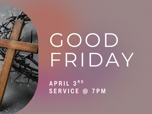 Join us as we gather for a special Good Friday Service as we remember the sacrifice of Jesus and reflect on the meaning of the cross. This will be a meaningful time of worship, Scripture, and reflection as we prepare our hearts for the celebration of Easter. Childcare Provided.