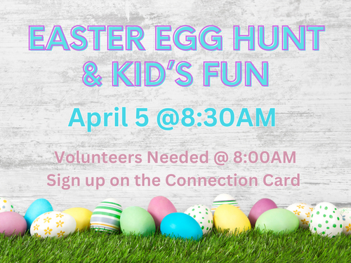 Join us on Easter Sunday at 8:30 AM for a morning of fun for the kids! Our Easter Egg Hunt will be divided by age groups so everyone has a chance to join in the excitement. Along with the egg hunt, kids can enjoy balloon animals, a bubble station, and fun inflatable games before the morning services begin. It’s a great way for families to celebrate Easter together! Want to help make the fun happen? We’d love a few extra hands! If you’d like to volunteer with the egg hunt or kids’ activities, simply sign up on the Connection Card.